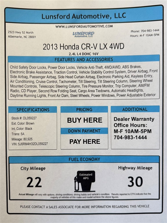 Lunsford Automotive attempts to provide accurate information on the inventory item listed above. The actual equipment may vary. Please confirm all vehicle options, accessories and prices with a sales associate to assure accuracy. This information is provided without representations or warranties of any kind, either expressed or implied. Prices do not include additional fees such as government fees and taxes, title and registration fees, finance charges, dealer document preparation fees, and emission testing